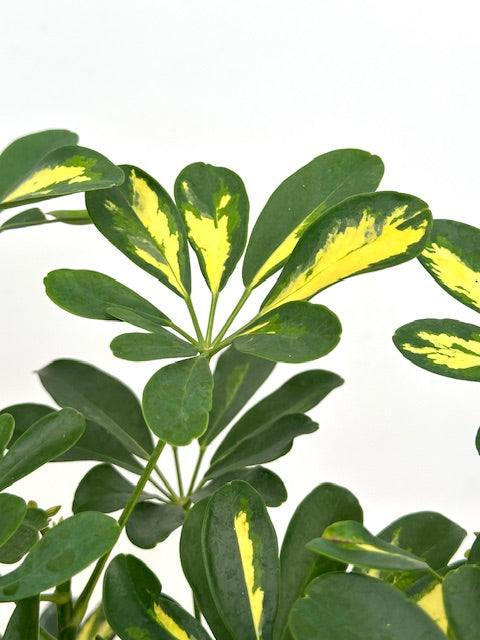Schefflera Arboricola is a bushy bush from Taiwan and China where it lives as a beautiful freestanding tree, or, surprisingly, can be found opportunistically clinging to the trunk of a larger tree, thriving as an epiphyte, snagging fallen leaf debris and dripping and misting water from the forest canopy. In the wild, or just planted outside in our temperate zone gardens, the plant can reach 25' but is tamer indoors getting more like 6'. Small branches and close set leaves make it super easy to prune for shape. The leaves look like hands, with shiny, loopy, oval, emerald green fingers radiating in a circle from a dot in the center. Classified as a flowering plant, the early fall blooms are rarely seen. Gold variegated has a lovely creamy yellow added to the leaves.