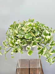 Small4" Pothos, N' JoyThe first N'Joy Pothos was espied growing in the midst of Pothos Marble Queens in a greenhouse in India. It was soon after reared so that the vines would turn out leaves sprouting very closely together, making this plant so very dense and lush, leaves and vines just tumbling over each other in joy. With loud, splashy, snowy white and apple green leaves and real long trailing vines, N'Joy is a lovely hanging plant or shelf plant. You can hang or drape it anywhere. It'll enjoy almost any conditions from somewhat low ambient light to brightest indirect light, which it actually enjoys best of all.