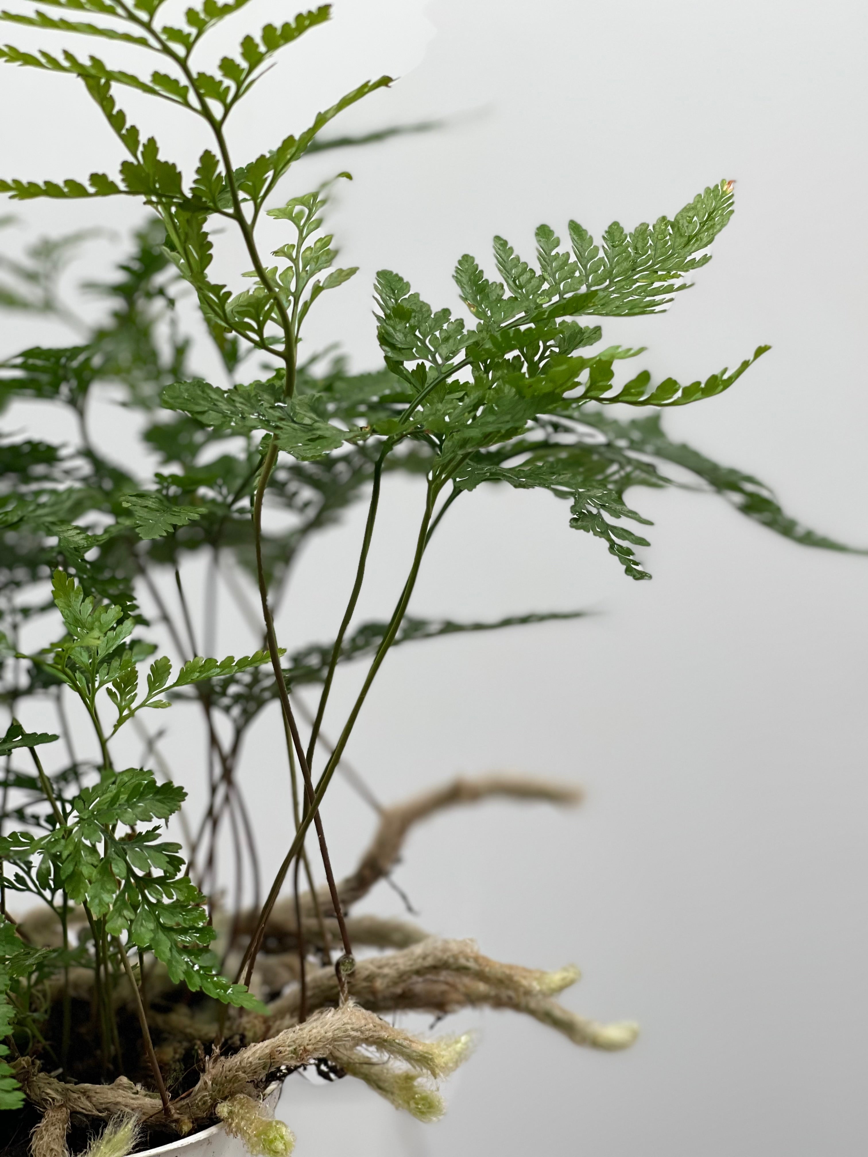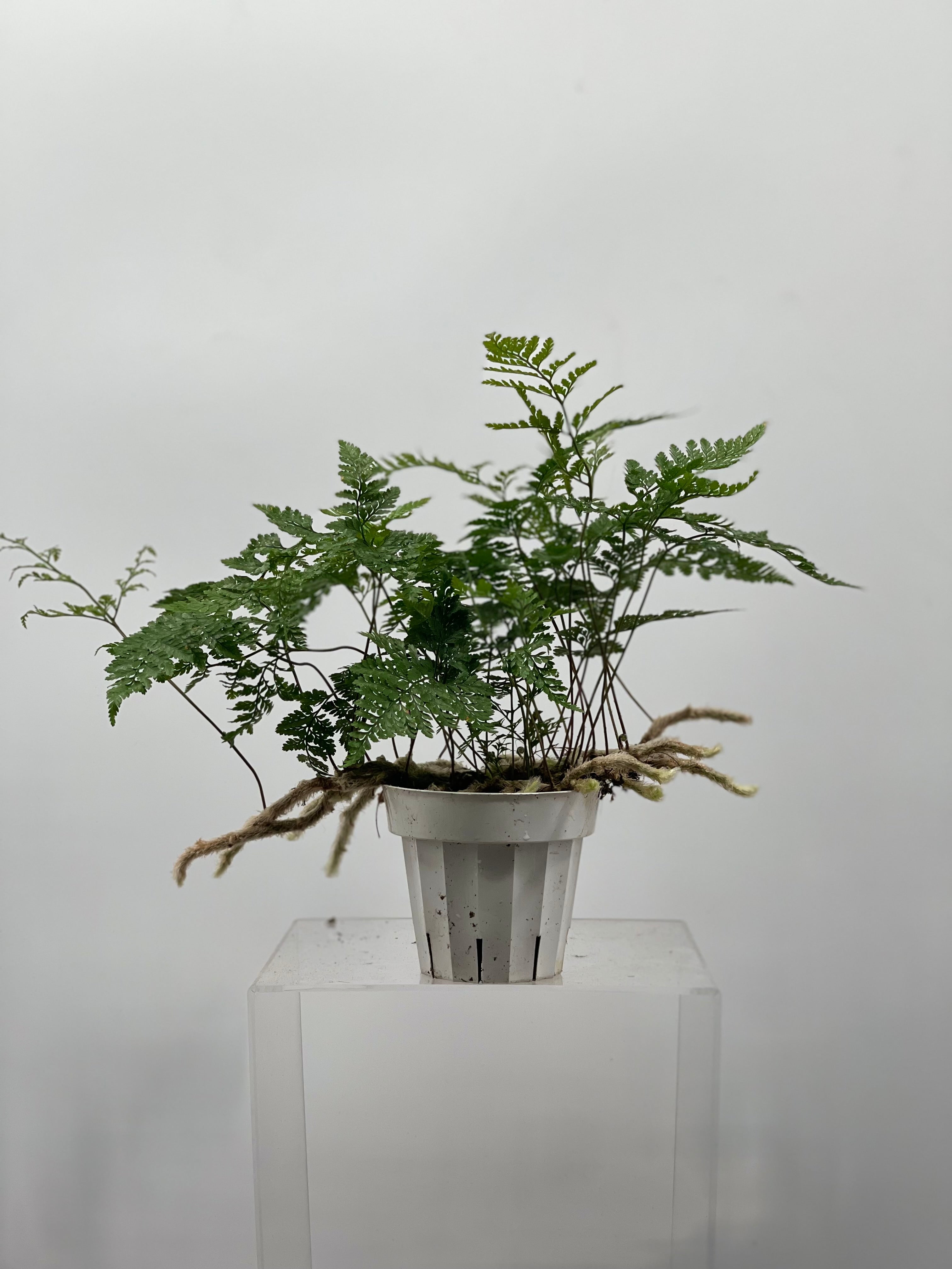 Korean Rock Fern is a tough little guy, so named because it does come from Korea and other east Asia areas, and loves growing in rocky forests and streambeds. In a rich dark green, the feathery, fancy lace fronds with wiry black stems and veins look delicate but are as hardy as can be. In the spring spores for making little baby Ferns will appear on the fronds. It is used as a handsome outdoor landscape plant in zones 7-9. The fronds are excellent used in flower arrangements and the potted plant is given as a housewarming gift in some Asian countries.